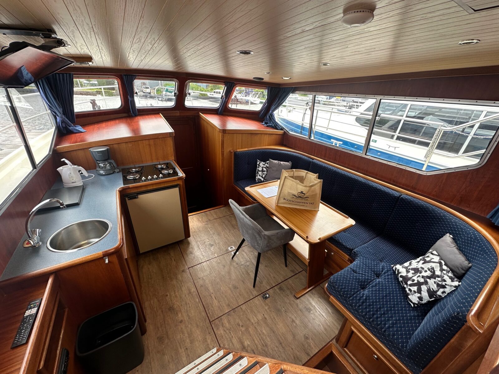 Die Salon ist ausgestattet mit ein große, luxuriöse Sitzecke mit Radio und Fernseher mit Automatischen Satellit Anlagen. Durch die große Fenster ins Salon haben Sie ein Wunderbar Aussicht.